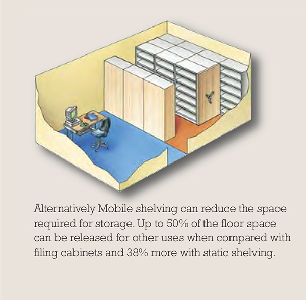 Mobile shelving is effective in saving space,by eliinating the need for several movies along floor tracks, the space for only one aisle is needed.when an item is required the particular shelving bay is identified and an adjacent aisle is created by moving shelving units apart.